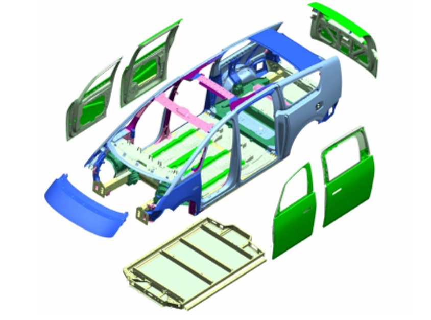 白车身总重量:641.9kg。其中:骨架重量:548.7kg;开启件和翼子板重量信息:左右前门总成:27.0kg;左右后门总成29.7kg;发动机罩盖:9.7kg;后备门:13.7kg,左右翼子板(两边之和):6.7kg。