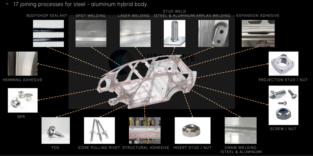 Li MEGA钢铝车身采用17种连接工艺,如传统电焊、MAG、MIG、激光焊接、阿普拉斯焊、胶接、SPR、FDS等。