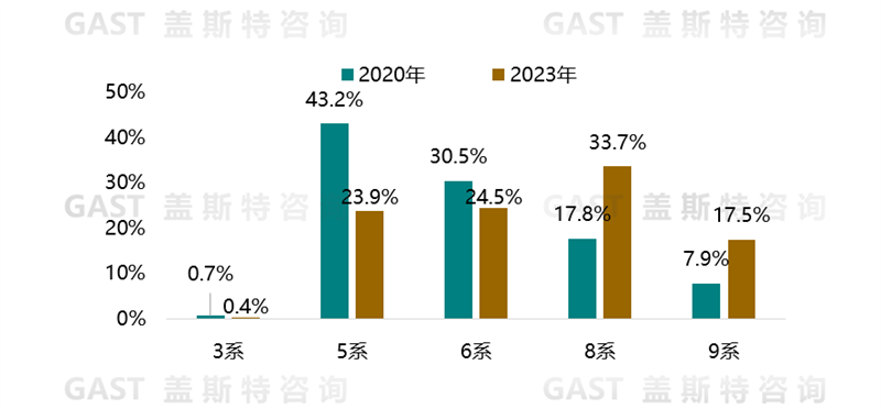 从技术路线上看,不同于磷酸铁锂电池型号较为单一,三元电池的特点是多种型号并存,包括3系、5系、6系、8系、9系等的。其中5系、6系的市占率在下降,8系、9系的市占率持续上升,具体情况参见图3。产能过剩相对集中在中低镍三元电池。