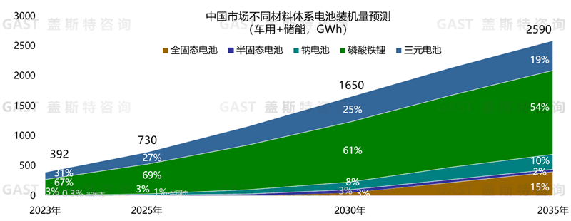 盖斯特基于各材料体系电池的技术发展趋势、成本竞争力、应用场景需求等综合研究,预判中国市场对动力电池的总需求及各材料体系电池发展趋势,详见图3。