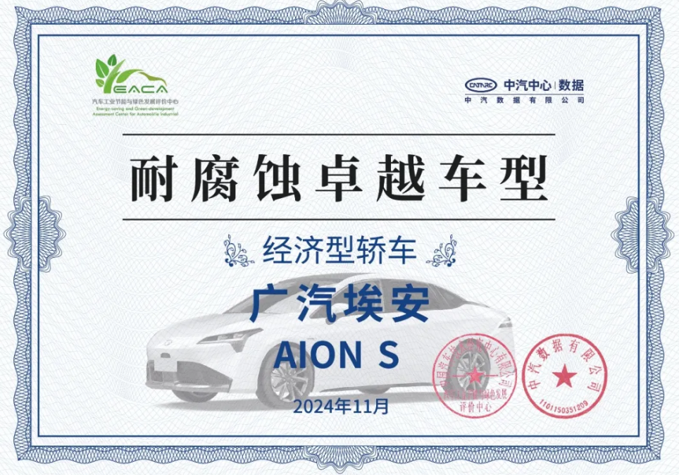 2024年中汽数据共进行了5个车型级别、27款畅销车型的耐蚀质量调研,并表彰在研究过程中耐腐蚀表现优异的车型。其中,广汽埃安AION S在同级别车型中脱颖而出,荣获“耐腐蚀卓越车型”奖项。