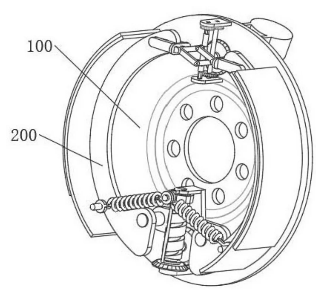 连接,制动蹄片的底端开设有轴孔部。本发明中,通过调节弹簧的设置,驱动机构带动驱动辊正向转动,驱动辊正向转动时,带动移动座下移,移动座拉动调节弹簧的一端下移,使得调节弹簧移动至圆杆和轴孔部连线的下方,从而在调节弹簧的拉力作用下,拉动两个制动蹄片向外偏转,使得刹车片与刹车鼓贴合挤压,随后驱动机构后续跟进,对两个制动蹄片的顶端之间进行支撑挤压,