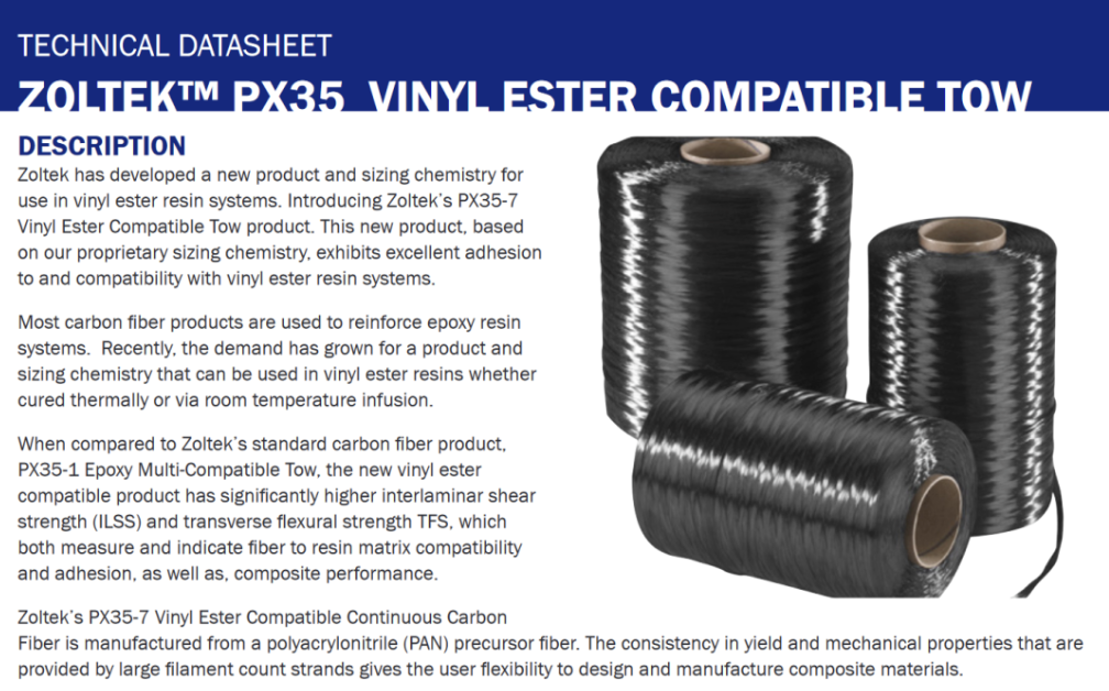 基于Zoltek公司专有的上浆剂,PX35-7型碳纤维由聚丙烯腈(PAN)前驱体纤维制成,50K大丝束规格,可以与乙烯基酯树脂基体表现出优异的附着力和相容性,具备高产量和机械性能一致性优势。