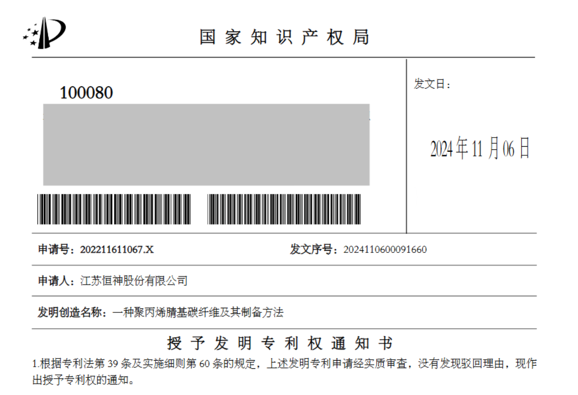 近日,江苏恒神股份有限公司最新获得一项发明专利授权,专利名称为“一种聚丙烯腈基碳纤维及其制备方法”,授权公告日期:2025-1-21。