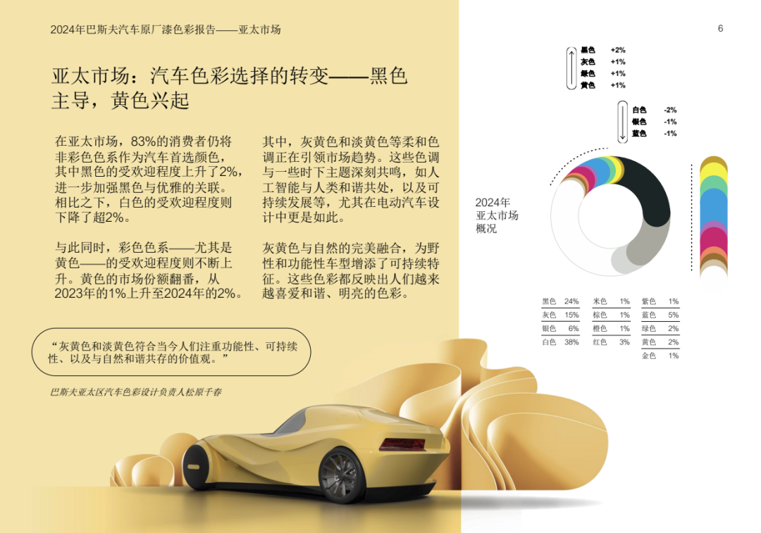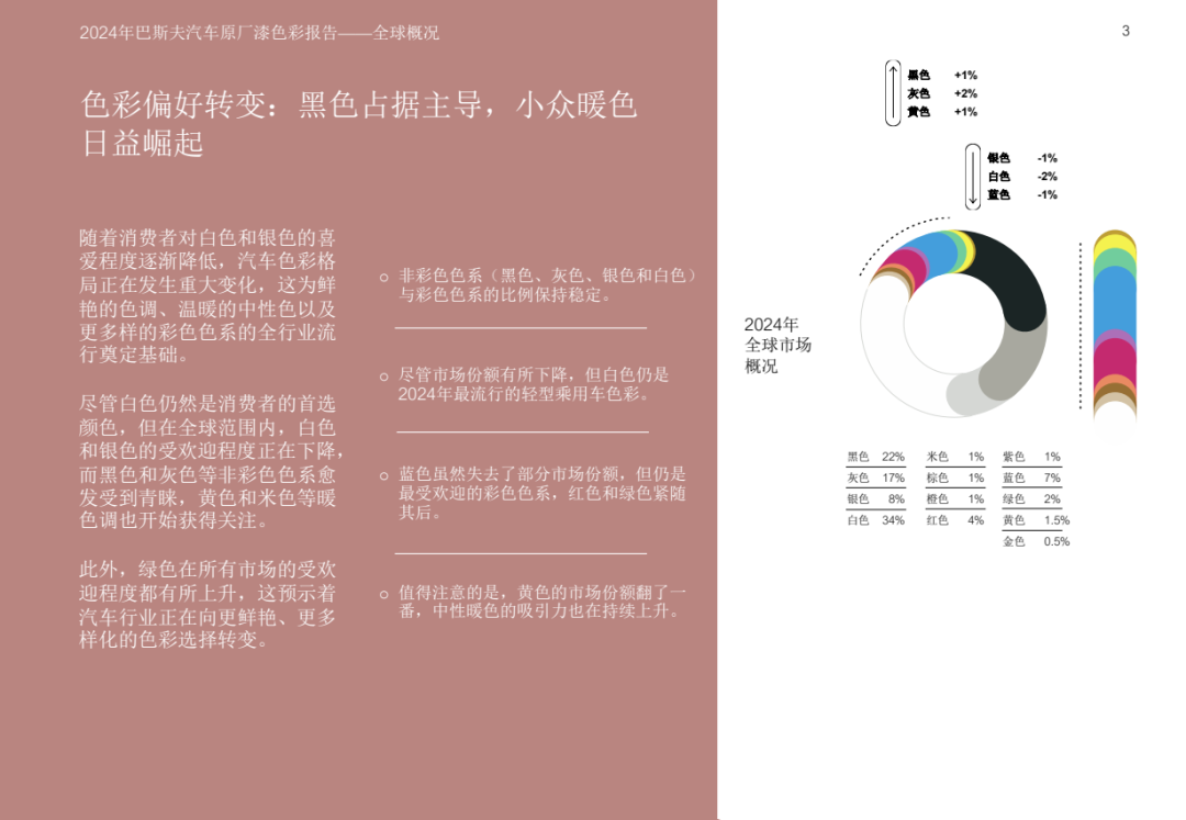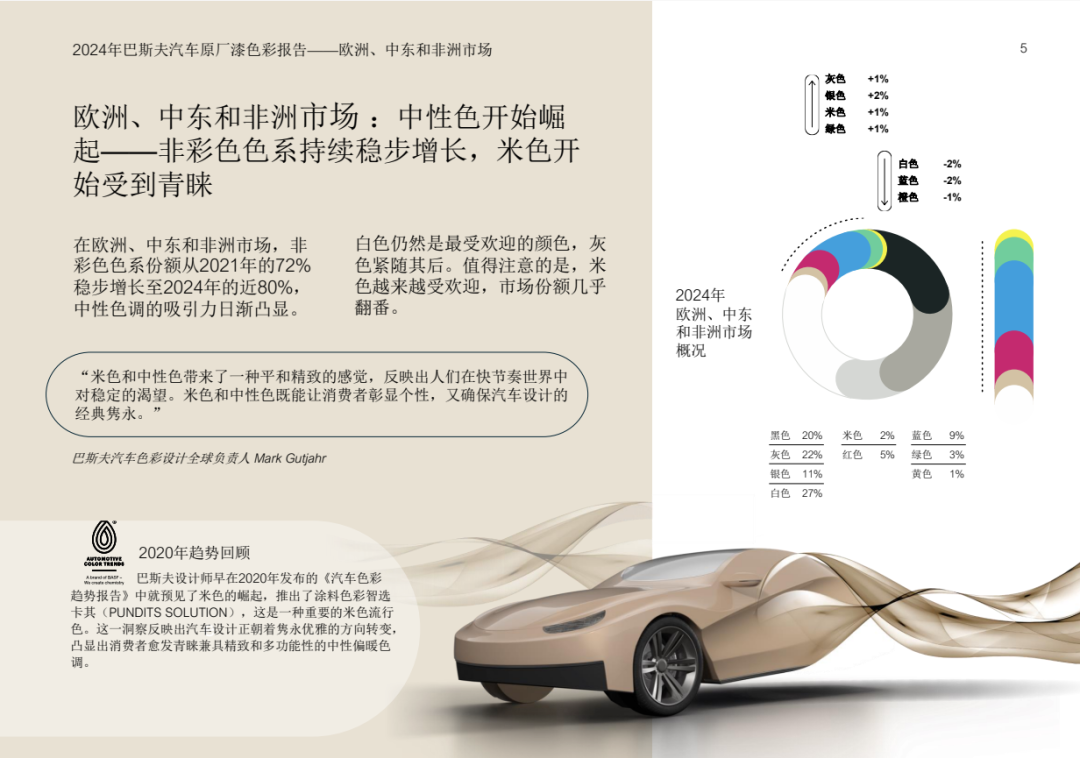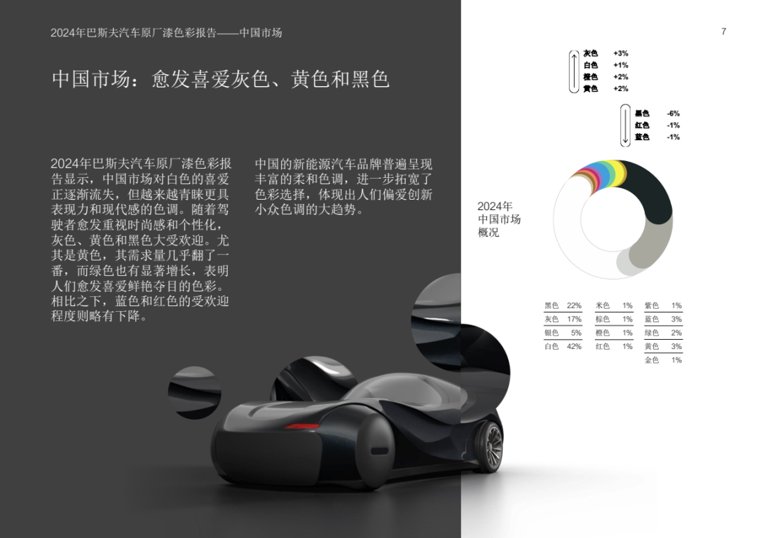 巴斯夫涂料业务部发布的《巴斯夫汽车原厂漆色彩报告》旨在深入探讨汽车行业色彩趋势,分析全球和各市场的CMF色彩偏好。该报告所提及的色彩比例由巴斯夫涂料业务部根据现有的全球汽车产量和乘用车涂料应用信息计算得出。