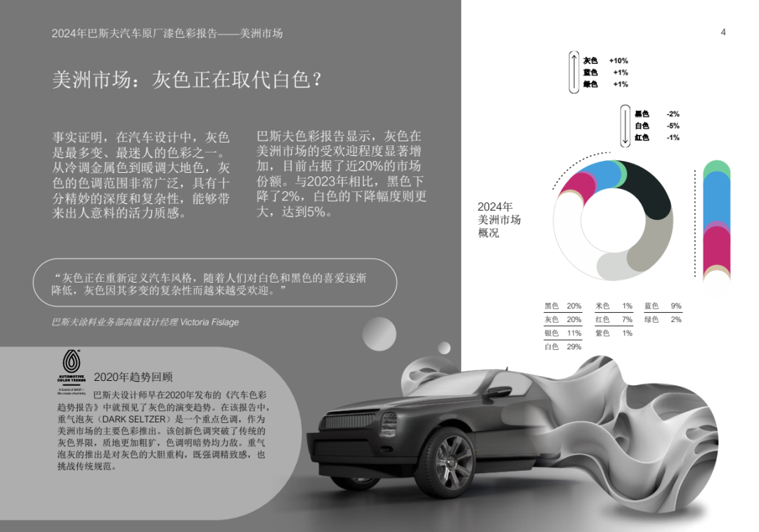 巴斯夫色彩报告显示,灰色在美洲市场的受欢迎程度显著增加,目前占据了近20%的市场份额。与2023年相比,黑色下降了2个百分点,白色的下降幅度则更大,达到5个百分点。