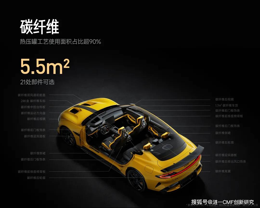 SU7 Ultra采用了大量碳纤维车身设计,全车覆盖21处碳纤维部件,其中采用热压罐成型工艺制成的1.7㎡碳纤维车顶,整体减重可达11kg,同时包括碳纤维大尾翼、双风道前舱盖、后视镜、车标、碳纤维座舱、方向盘、迎宾踏板、中控台饰板、车标等,碳纤维总使用面积达5.5㎡,实现整车减轻至仅1900kg。大量碳纤维的使用,提升了车身的刚性和抗扭性能,使汽车在轻量化的同时彰显性能感。