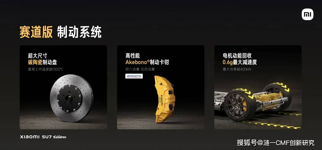 SU7 Ultra标配430mm前碳陶瓷制动盘(目前轿车领域最大尺寸之一)、Akebono®️高性能卡钳、前六后四活塞及21”倍耐力 P ZERO 5赛道轮胎,100km/h-0制动距离仅需 30.8米,连续10次高强度制动无衰减,完美适配赛道极限驾驶。