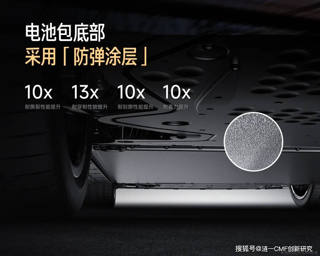 SU7 Ultra电池包底部创新采用防弹涂层技术,其耐刮擦、耐穿刺性能比传统PVC涂层提升10倍以上。这种聚脲基材料在极端路况下可抵御剐蹭和冲击,为电芯提供“铠甲级”防护,大幅提升安全冗余。