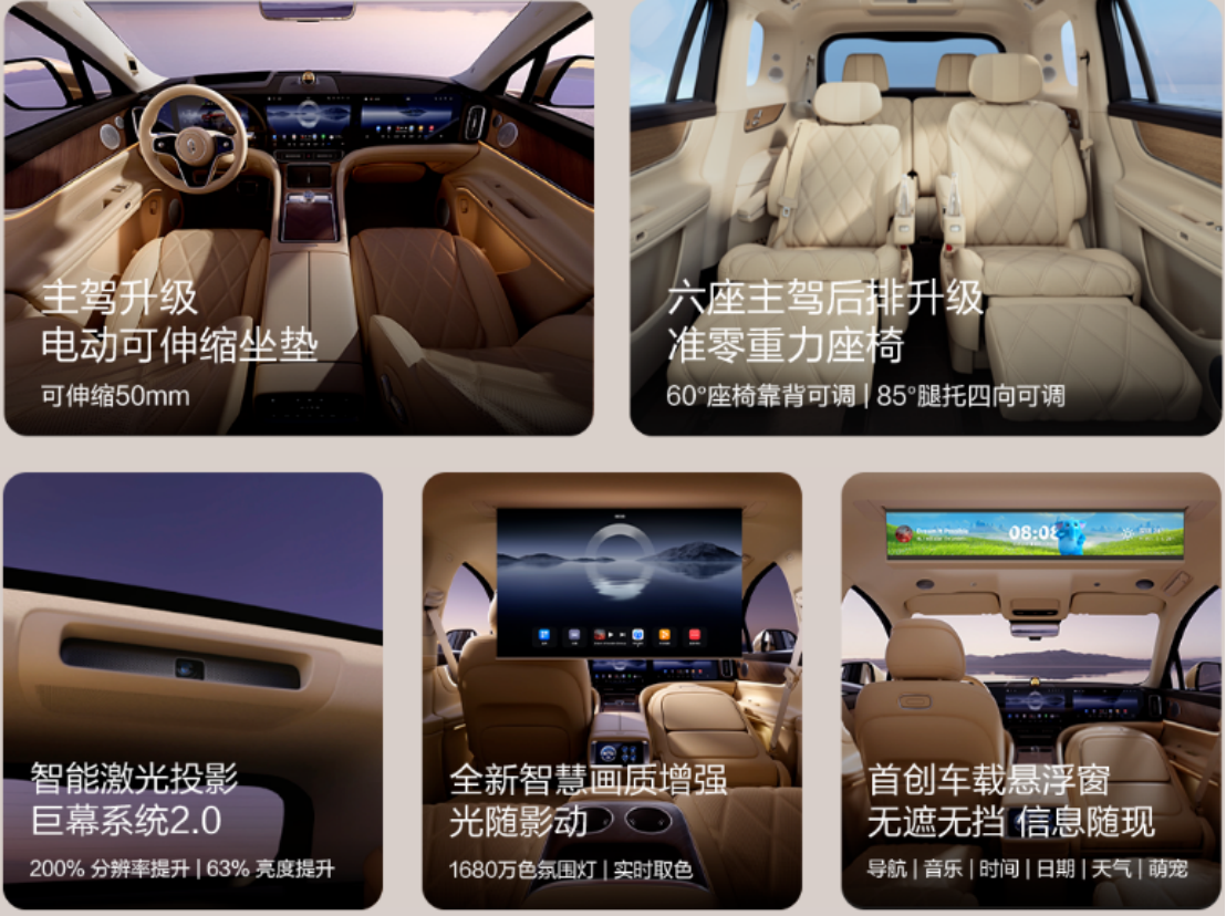 内饰部分,25款问界M9新增了望舒杏、琥珀棕、松露棕三款选装配色,并对前排座椅坐垫进行了加长处理,进一步提升了乘坐舒适性。一体式三联屏、AR-HUD抬头显示、三幅式多功能方向盘、智慧水晶旋钮等配置悉数保留,同时还新增了流媒体内后视镜和华为星河通信系统,兼具科技感与实用性。