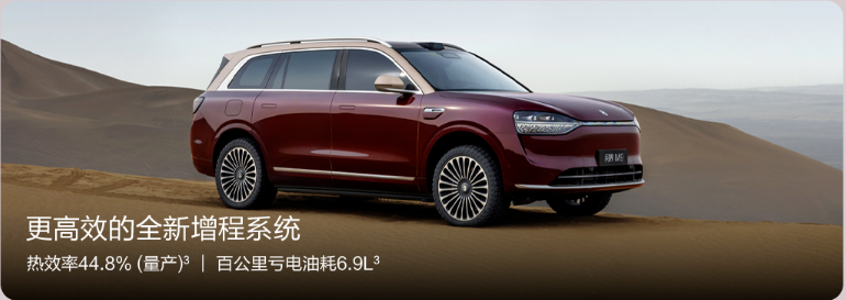 动力方面,2025款问界M9提供纯电及增程两套动力系统供选择。增程版车型搭载更高效的增程系统,热效率达到44.8%,百公里亏电油耗仅为6.9L,纯电续航290km,综合续航达到1474km。纯电版车型采用双电机布局,前电机最大功率为160kW,后电机最大功率230kW。