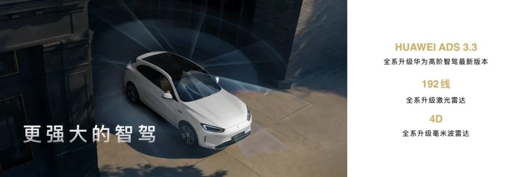 智能驾驶方面,新车全系搭载了华为ADS 3.3智驾系统,包括192线激光雷达、4D毫米波雷达和27个智驾传感器,可以支持高速/城区领航辅助驾驶、智能泊车等功能。
