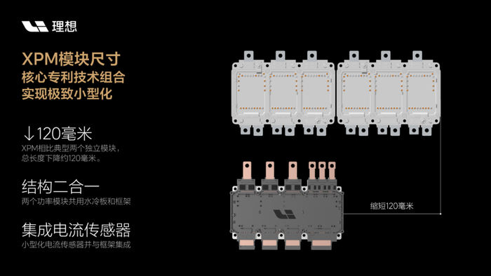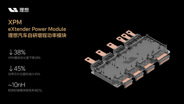 XPM(eXtender Power Module)功率模块是理想汽车历时3年研发打造的增程专用二合一功率模块,围绕XPM相关技术,已完成超过50件专利布局。该产品通过5大类核心技术创新实现了功率模块性能指标行业领先,不仅可以助力增程电驱动系统以更优异的成本实现极致的关键技术指标和系统收益,也可以扩展应用到其它采用双电机控制器的混合动力系统。在模块开发中,理想汽车还首次运用了中车第7.5代超精细沟槽IGBT芯片先进技术,并基于其多场景封装测试平台验证了该功率模块出色性能,实现了行业领先的产品力。