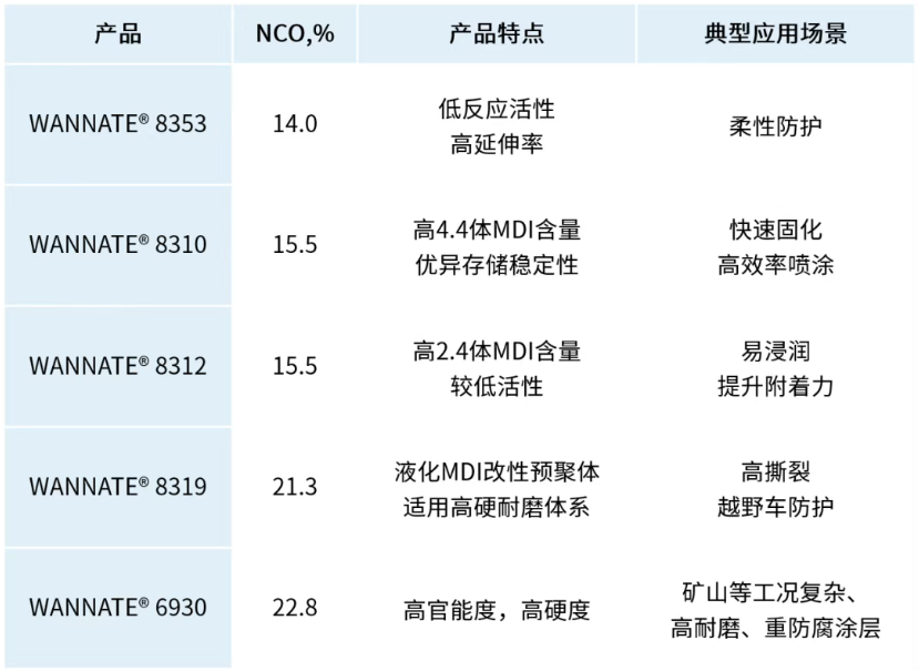 万华化学开发多场景喷涂聚脲用预聚体产品矩阵,不同类型产品精准匹配差异化防护需求,并可提供定制化方案。