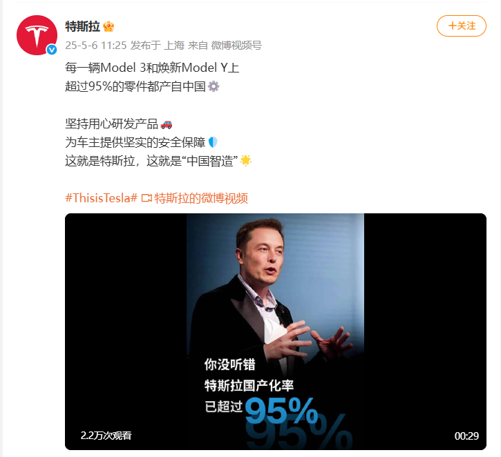 【汽车材料网】特斯拉官方账号今日在社交平台发文:每一辆Model 3和焕新Model Y上,超过95%的零件都产自中国。