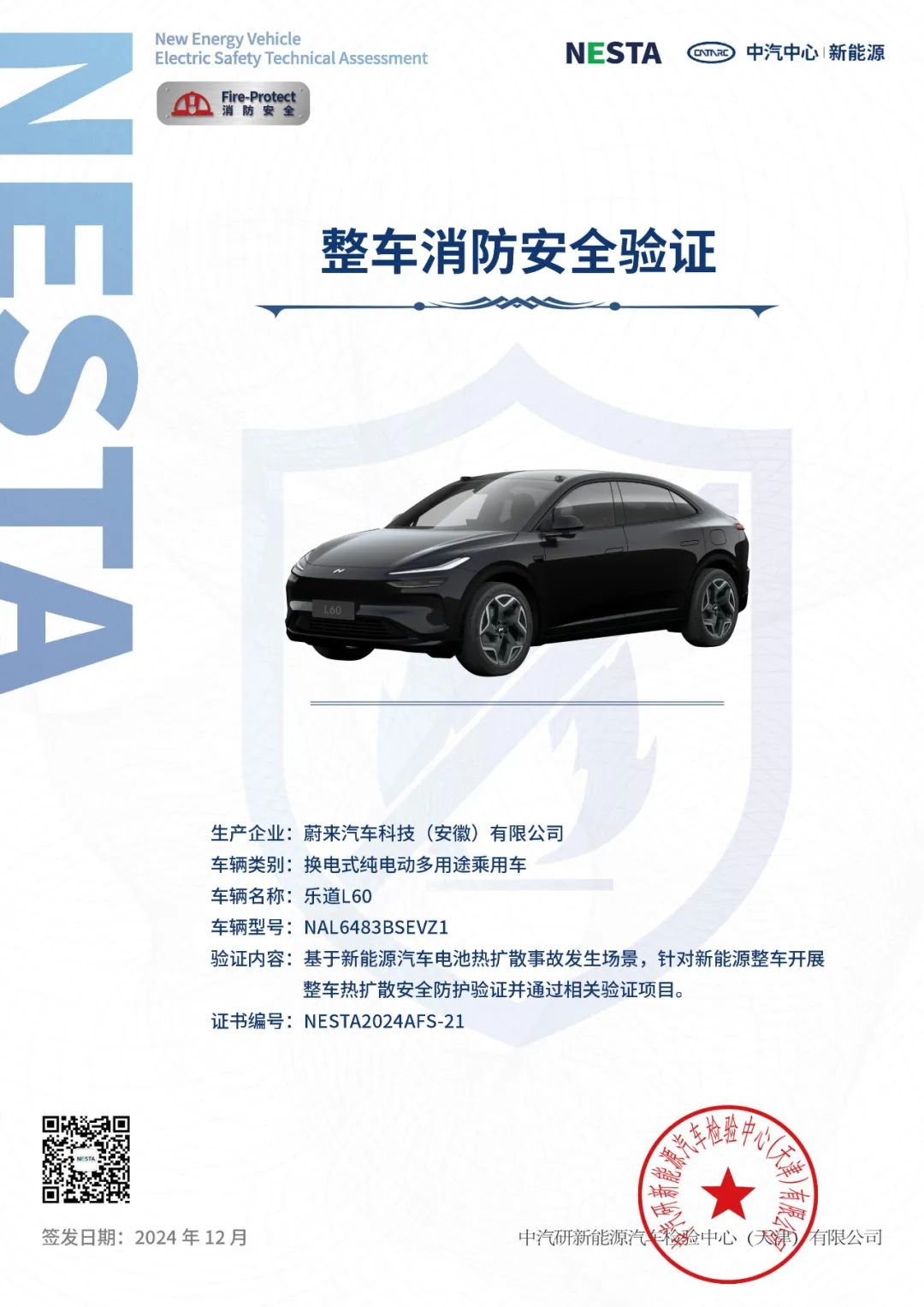 2024年12月,中汽中心新能源检验中心依照NESTA消防安全测试标准,对乐道L60进行整车热失控防护测试。