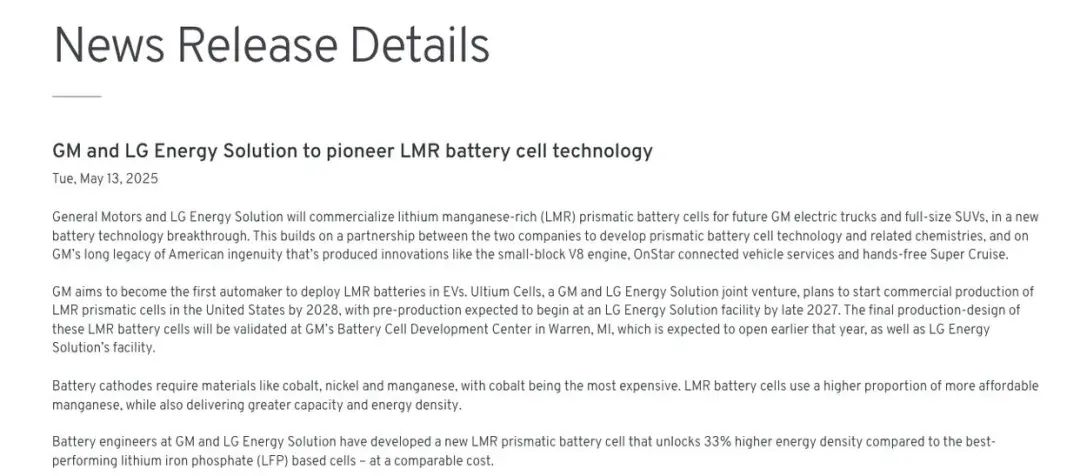 值得一提的是,美国福特汽车也在上个月宣布,计划于2030年推出LMR电池产品。所以通用强调“率先部署上市”,主要是为了抢走美国同行的风头。