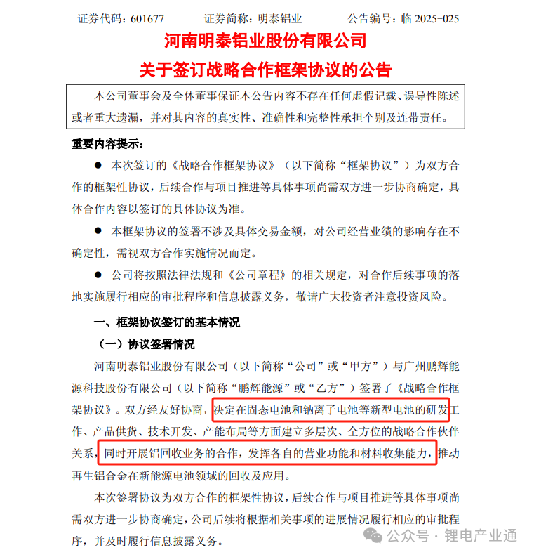 根据协议显示,鹏辉能源将优先采购明泰铝业的产品用于固态电池等项目的开发。