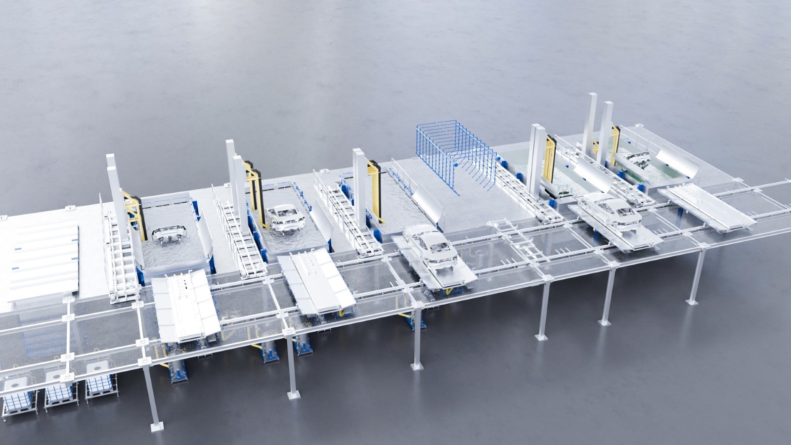 EcoProWet系统是中小产能涂装车间的理想选择。其模块化组合支持产线在7.5台至30台/小时之间进行分阶段柔性扩展,不会对正常生产造成显著影响。通过“按需扩展”模式,汽车制造商能够根据实际产能灵活配置设备,与传统的连续式浸涂系统相比,这种方式能够减少涂料消耗和运营成本。此外,紧凑型布局显著减少了涂装车间的占地面积,实现了工厂布局的高效规划和动态调整。