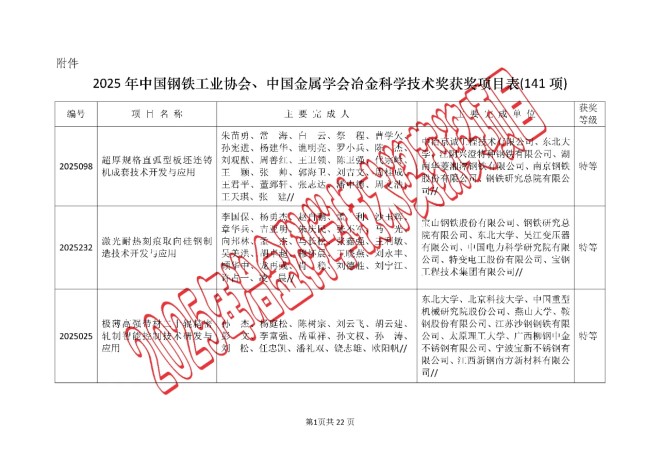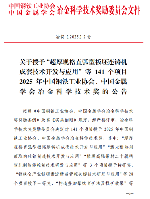 关于授予“超厚规格直弧型板坯连铸机成套技术开发与应用”等141个项目2025年中国钢铁工业协会、中国金属学会冶金科学技术奖的公告