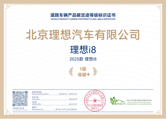 值得一提的是,在近日由汽车工业节能与绿色发展评价中心主导的汽车低碳标识等级评定中,理想i8凭借出色的环保性能脱颖而出,成功获得中汽中心认证的低碳标识最高等级(1级)殊荣。数据显示,理想i8的全生命周期碳排放量仅为244.53克二氧化碳当量每公里,较同级别车型平均水平降低约7%,累计可减少约2.7吨碳排放,这一减碳量相当于一台20瓦节能灯持续工作27年所产生的碳排放总量。
