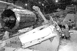 为抢占市场,增加效益,桂林轮胎加快全钢巨胎二期项目建设,目前巨胎两次法成型机已到货并已就位安装,预计月底可以出胎。该项目完成后,可增加产能1056条/年,新增销售收入2亿元/年。图为工作人员进行设备安装和调试。