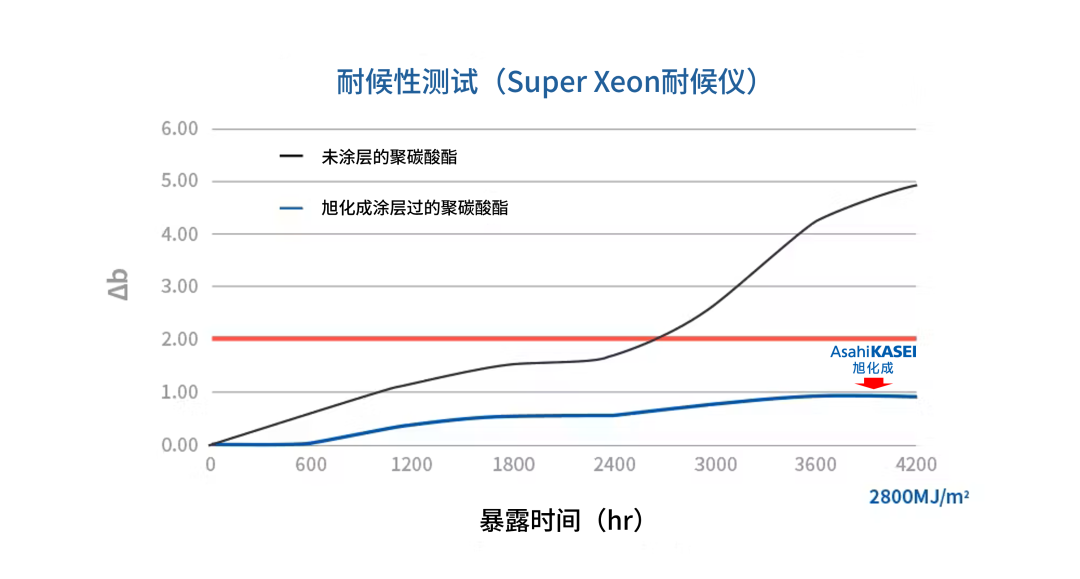 蓝色线条表示使用旭化成硬化图层剂后耐候性表现