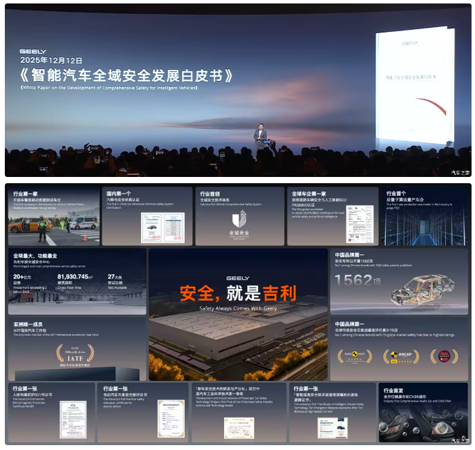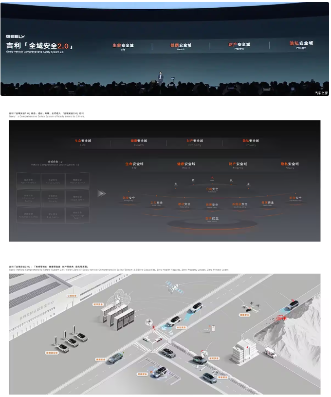 与此同时,吉利还发布了吉利“全域安全2.0”,包括生命安全域、健康安全域、财产安全域、隐私安全域,保证生命零伤亡、健康零危害、财产零损失、隐私零泄露。将以往更关注车的安全系统,迭代为更关注“人”的驾驶安全、救援安全等系统;并提出“公域安全”系统,将“汽车安全”的本质,从关注驾乘人员和行人的视角,提升到为全行业、全社会谋福祉的高度。