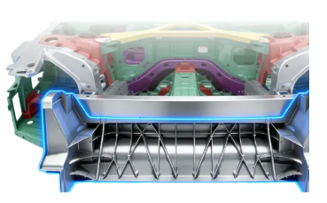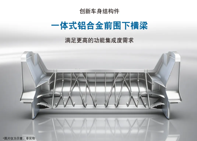 传统钢制方案通常是冲压钣金件通过焊接、铆接等方式拼装而成,而GF的铝合金一体压铸方案,可以将结构复杂的前围下横梁一次压铸成型为一个完整的零件。