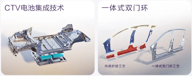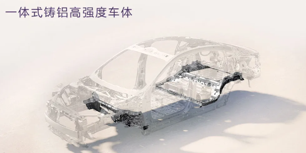 采用一体式铸铝高强度车身,通过7700T压铸机将80个散件集成为2个压铸件,整车扭转刚度提升35%。一体式热成型双门环的运用,将车门上方的侧围部件从原先的多段拼接改为一次性热成型制造,有效攻克了大型部件在强度方面的技术难点,并额外带来车身刚度5%的提升。减少焊接点的同时,让车身扭转刚度达到35000Nm/deg,稳定性大幅提升。