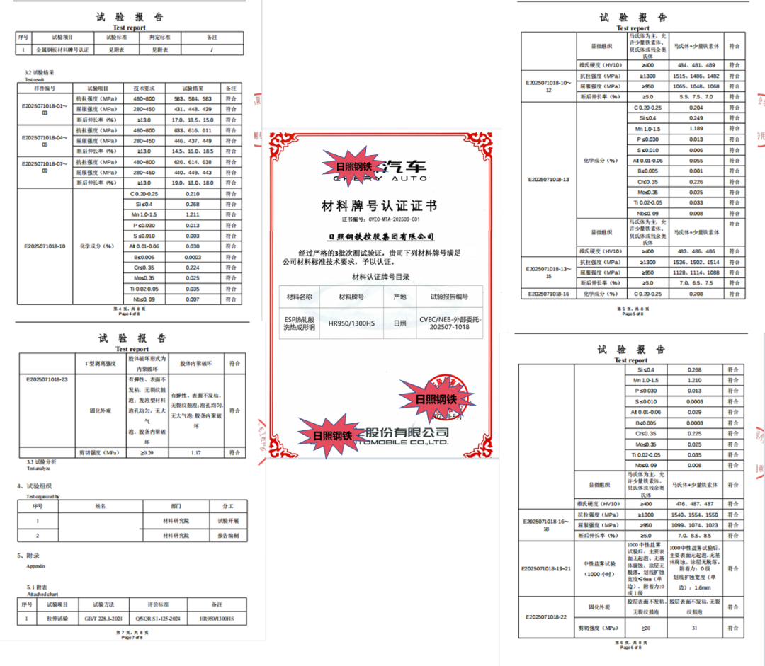 此次主机厂认证对原料及淬火料板性能进行了严格检验,涵盖拉伸、维氏硬度、低周疲劳、盐雾腐蚀、粘胶检验等项目,结果均满足性能要求;权威第三方机构中国汽研的检验则更具深度,开展了对氢致延迟断裂、极限尖冷弯、焊接、高速拉伸等九项检验,全方位对标冷轧产品,为ESP热成形钢确立了品质基准。一系列数据充分印证了日照钢铁ESP短流程热成形钢完全可媲美传统冷轧热成形钢。