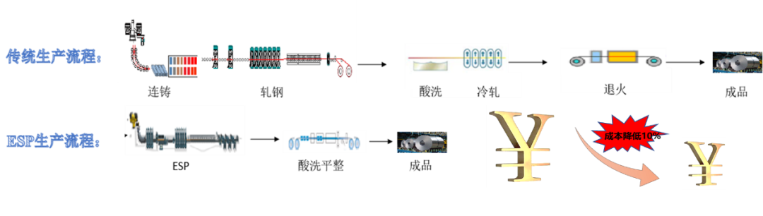 制造流程变革带来低成本与低碳排双优势,直接省去热轧加热炉、冷轧、退火3大高能耗工序,从工艺源头上砍掉“耗能大户”,工序成本较传统路线直降10%;碳排放量较传统路线降低15%~30%,满足汽车钢低成本的即时需求,契合低碳排放的发展趋势。