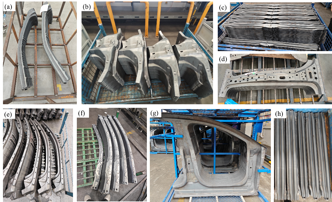日照钢铁ESP短流程热成形钢部分规模化应用案例:(a)A柱加强板;(b)前纵梁后端;(c)车门防撞杆;(d)B柱加强板;(e)A柱上加强板;(f)A柱加强内板;(g)单门环;(h)车门防撞杆。