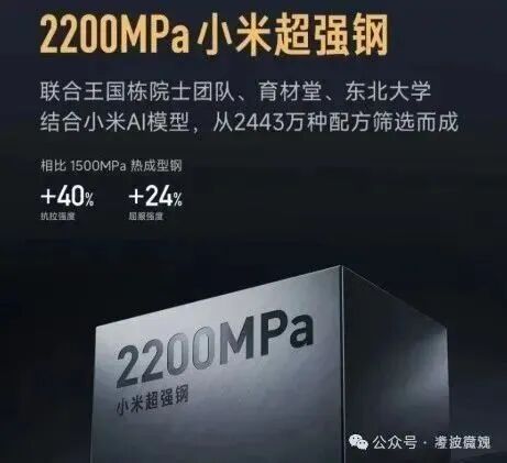 2025年5月22日,小米发布2200MPa超强钢,2200MPa超强钢由王国栋院士团队、育材堂、东北大学共同研发,是目前汽车行业中最强的热成型钢。