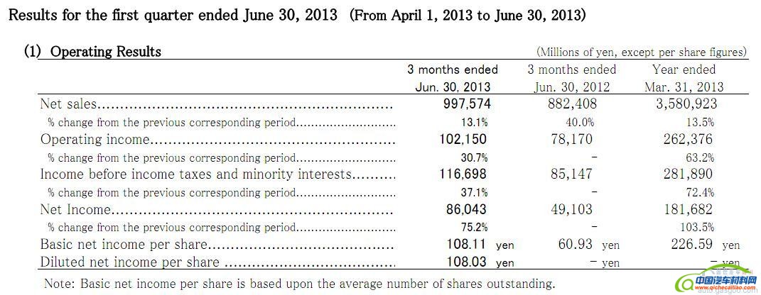 2013至2014财年第一季度,即2013年第二季度,电装全球营业收入为9,975.74亿日元,约合101亿美元,去年同期8,824.08亿日元,今年同比增长13.1%。