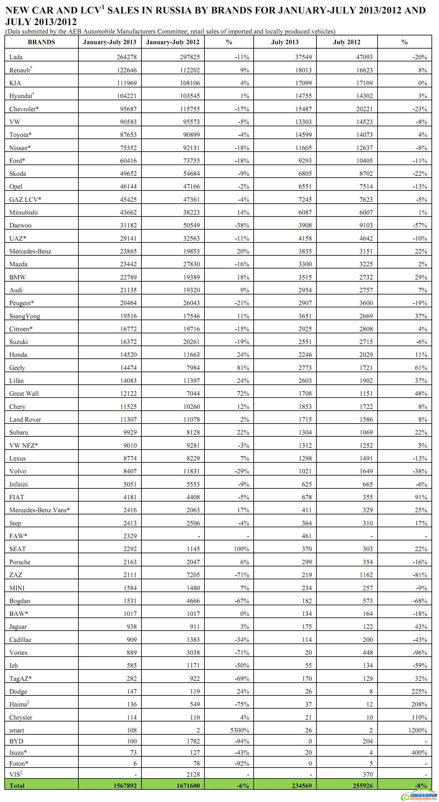 2013年7月,俄罗斯轻型车(涵盖乘用车及轻型商用车)总销量为234,569辆,而2012年7月销量255,926辆,今年同比下滑8.3%。这是自从今年3月份以来,俄罗斯车市连续第5个月出现销量同比滑坡。