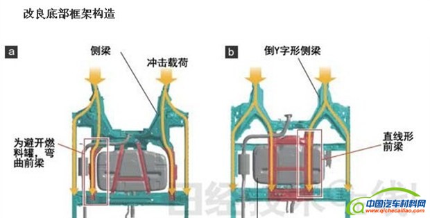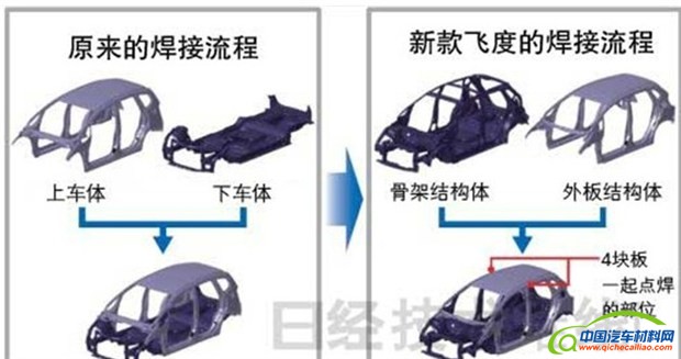 全新飞度出于内部空间的考虑沿袭了现款的中置油箱布局,把油箱放到了车辆中央。油箱需要安装在车辆底部,这也就导致原来的底盘框架需要与油箱和平共处。由于当时连接技术的不成熟,所以将底盘框架设计成了上图左侧的样子。该结构采用曲线设计,在受到冲击时会受到弯曲应力,所以本田需要采用加厚钢板等措施加固。而全新飞度采用全新的连接方法,将底盘框架与油箱巧妙结合(上图右侧)。全新的直线结构相比现款受到弯曲应力很小,所以能相应地减薄底部框架,并省去了加固部分,通过采用这种构造并使用高张力钢板,新底盘比原来减轻了12%。