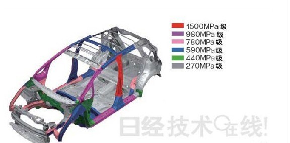 新一代飞度的车架使用了更高强度(抗拉强度)的钢材,相比现款提升很大,从图中可以看出,其中包括:13%的780MPa钢材、8%的980MPa钢材和2%的1500MPa钢材。使用高强度钢材的目的是:在保证车身强度的前提下,钢材强度越高,钢板厚度就可以相应削减,从而达到减重的目的。通过这项技术,新飞度减重9kg