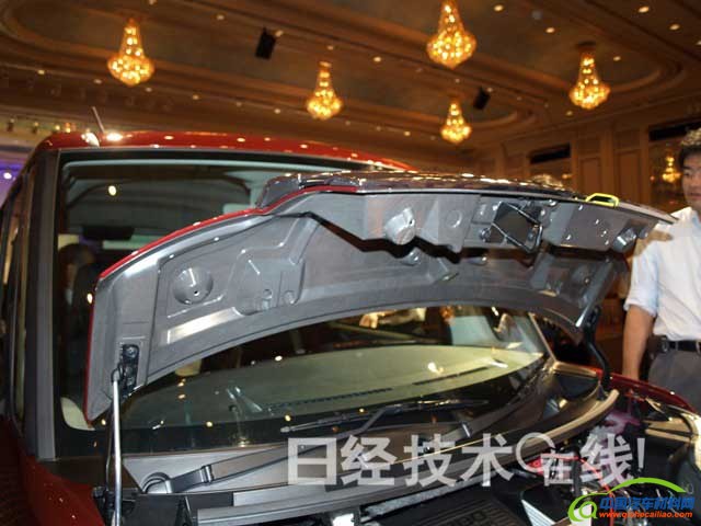 发动机罩和后门采用以粘合剂粘合内外两块树脂板的构造,外板均由PP(聚丙烯)制成,发动机罩的内板由SMC(片状模塑料)制成,后门内板则由添加了25~30%玻璃短纤维的PP制成(图2、图3)。由于发动机会散发热量,发动机罩必须具备耐热性,于是大发选用了SMC。另外,前翼子板采用了一块PP板。