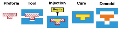该工艺是将纤维经预成型,预编织处理,纤维铺放可设计,制品受力合理。预成型纤维体预先铺放在模具型腔内,合模后通过设备用压力将树脂注入模腔,浸润纤维,固化成型,闭模操作,不污染环境,采用多模,多工位机械注射模式,生产效率较高。需要树脂灌注设备及多套模具,适于中等至大批量生产方式,制品双面光,尺寸精度高,可做结构复杂零件及镶件,如汽车地板、车顶、发动机罩等,是汽车行业应用最广泛的工艺。