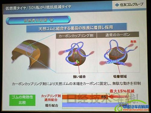 住友橡胶是通过改进橡胶配比及轮胎构造减少了由轮胎变形导致的发热,降低了滚动阻力,同时提高了抓地性能。胎面使用的材料为SBR(苯乙烯丁二烯橡胶),研发人员分析了在其高分子中苯乙烯、丁二烯如何排列才能提高湿地抓地力,对分子骨架进行了优化设计。