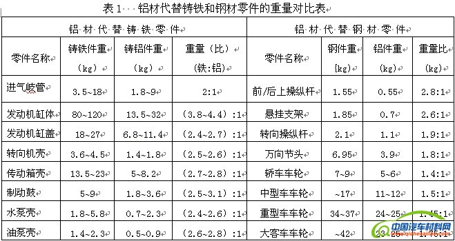 为了减轻汽车自重,一是改进汽车的结构设计,二是选用轻质材料(如铝合金、镁合金、塑料等)制造。到目前为止,前者已无太大的迥旋余地,因而汽车行业普遍注重于开发利用新的高强度钢材或铝、镁等合金材料。在轻质材料中,由于聚合物类的塑料制品在回收中又存在环境污染问题、镁合金材料的价格和安全性也限制了它的广泛应用。而铝合金材料由于有丰富的资源,随着电力工业的发展和铝冶炼工艺的改进,将使铝的产量迅速增加,成本相应下降,铝合金材料更兼有质轻(钢铁、铝、镁、塑料的密度分别为:7.8、2.7、1.74、1.1-1.2g/cm3)和良好的成型性、可焊性、抗蚀性、表面易着色性,而且铝合金材料的回收率约为80%,有60%的汽车用铝合金材料来自回收的废料,预计到2015年回收率可进一步提高到90%以上。理论上铝制汽车可以比钢制汽车减轻重量达30%-40%,其中铝质发动机可减重30%,铝散热器比铜的轻20%-40%,轿车车身的比钢材制品减重40%以上,汽车铝车轮可减重30%。因此,铝合金材料是汽车轻量化最理想的材料之一,见表1。
