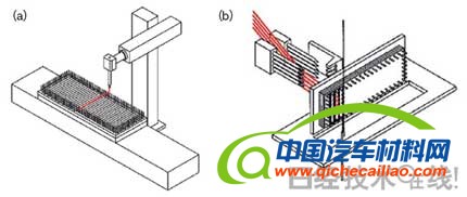 | 图16 三维织物的织机 (a)由缠绕在四周竖起的纺针上制造纤维片的装置,以及(b)沿着厚度方向插入纤维丝的装置构成。可制造厚度为10mm以上的织物。 |