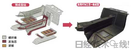 | 图12 地板采用RTM工艺将10个预成型坯合为一体 最初的设计将地板分为6个部件,后来采用RTM工艺统合成了一个部件。不仅减少了模具,还将工时缩短了80%,与粘合组装相关的机械加工减少了50%。成型时结合使用了RTM工艺与注入压缩工艺。 |