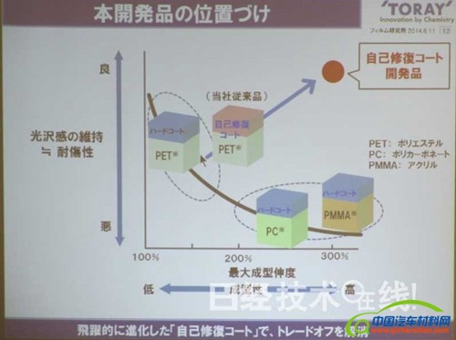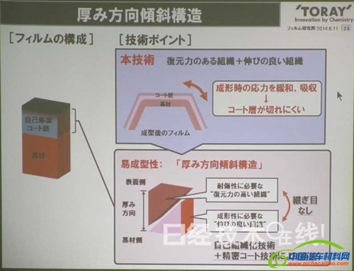 东丽利用该公司独有的涂层技术,开发出了新型自我修复涂膜,该产品的最大成型拉伸率高达300%,同时实现了出色的易成型性和耐划伤性,而且长期使用也能保持光泽。该公司打算将其应用于汽车内饰、电子设备、家电产品的外装用装饰成型膜等用途。今后,该公司将与东丽薄膜加工公司一起,加快确立生产技术的步伐,尽快使该技术投入实用。