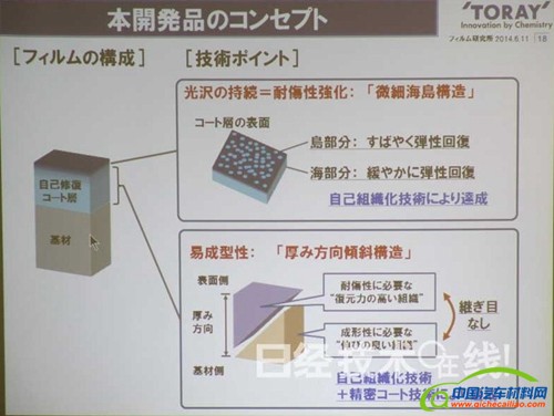 而东丽此次开发的自我修复涂膜不仅具备最大成型拉伸率高达300%的易成型性,而且耐划伤性也远远高于以前的产品。为了实现这些性能,该公司实施了两大改进。一个是通过涂层表面的“微细海岛构造”提高了耐划伤性。该公司利用自组织技术,在涂层表面采用了由“迅速恢复弹性的组织”(对高速冲击有效)和“缓慢恢复弹性的组织”(对大力量冲击有效)构成的微细海岛构造,从而大幅提高了涂层的自我修复能力。这种复原能力较强的组织可以提高涂层的耐划伤性,因此,即便在各种条件下长期使用,也能保持薄膜表面的光泽。