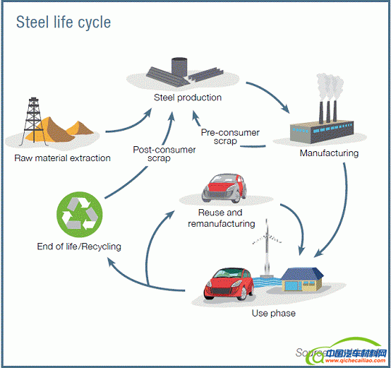 为延续我们所做的努力,以及识别钢铁生命周期中所有的减排机会,关键在于放眼整个生命周期。生命周期方法不仅考虑钢铁产品制造的相关排放,而且考虑因为使用新一代钢铁,以及减轻产品重量和增加产品强度而带来的减少能耗的效果。此外,在搜索面向未来的可持续材料时,必须重点考虑钢铁的内在可循环性。下图所示为如何识别钢铁整个生命周期期间的改进机会。