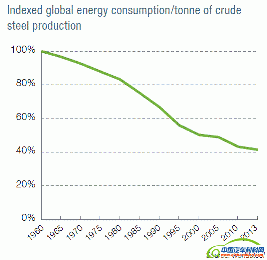 在过去 50 年间,钢铁行业已将每吨钢铁生产消耗的能源降低了 60%。不过,由于能源效率的急剧提升,据估计,在现有技术基础上的改进空间并不大。全球二氧化碳总体排放水平的保持和提高,需要开发和引进根本性的、碳足迹更低的新型冶炼技术。目前正在研究的许多技术都与碳捕获和存储相关,这些技术的实施离不开政府和公众的支持。