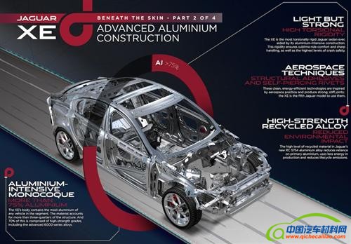 捷豹XE将是使用标号为RC5754的高强度铝材的首款车型。RC5754是专门为XE开发的材料,50%来自回收再利用铝材,帮助捷豹实现在2020年将回收再利用材料的使用率达到75%的目标。大量采用回收材料也降低了生产过程的耗电量,帮助捷豹降低产品的总碳足迹。