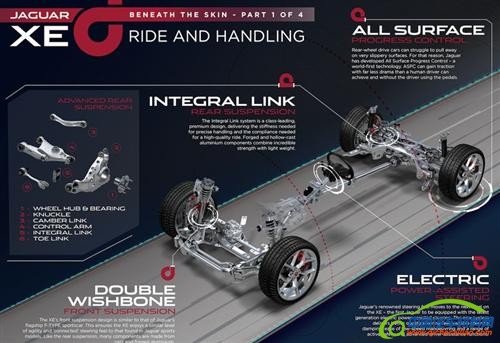 在第一次技术发布会上,捷豹展示了XE将采用的底盘技术,包括该级别独一无二的Integral link后悬架。相比常规多连杆悬架,捷豹说Integral link悬架的侧向和纵向刚度更高,所以性能更加优秀。Integral link连杆带来了更直接的转向和操控响应,同时驾驶性能成熟、豪华。该悬架的许多部件采用锻造和空心铸造加工而成。